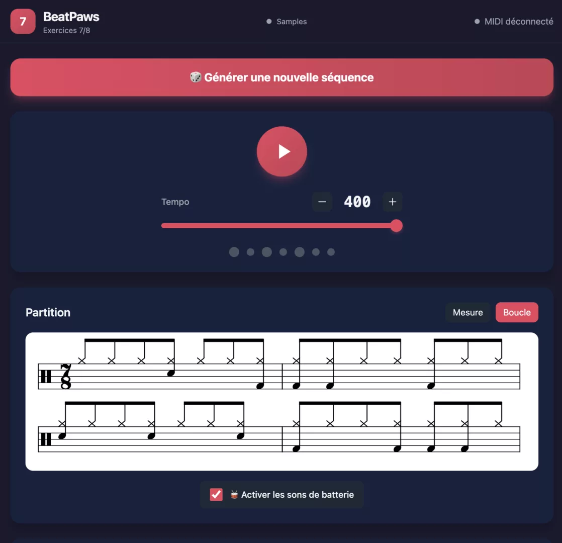 BeatpawsJazz & World music drumming Coming soon Metronome v.1Metronome with subdivisions, tap tempo, mesures gap, rhythm trainer. 7/8 WorkoutSnare and bass drum eighth-note grouping patterns CoursesComing soon